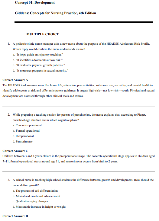 Whether preparing for class exams, certification boards, or the NCLEX, the Concepts for Nursing Practice, 4th Edition Test Bank by Jean Giddens is a trusted study aid that enhances knowledge, sharpens test-taking skills, and builds clinical confidence. With its focus on critical thinking and concept-based learning, this resource ensures students are well-prepared to deliver safe, effective, and compassionate patient care.